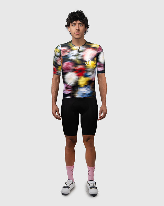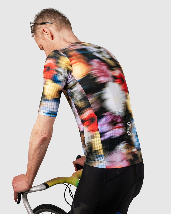 The Velocita Jersey tells a story, though admittedly it’s not one we set out to tell. Born from a "happy little accident" with a slip of the palette knife. Once we saw the results, we thought, “What if we cranked the motion blur to 11?” The result? A jersey that makes you look like you’re flying, even if you’re just lingering at the coffee shop counter, waiting for your latte and contemplating a cookie.
